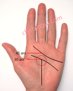 În jos, spre baza palmei – mergem spre copilărie, iar în sus, spre degetul lui Saturn (degetul mijlociu) – mergem spre bătrânețe.