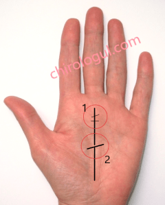 Dacă sunt multiple linii transversale care doar trec peste linia Destinului dar nu o taie in două (1), acesta arată apariția în mod frecvent a unor interferențe si impedimente legate de starea materială, dar nu chiar atât de greu de depășit. Dacă însă avem o întrerupere a Liniei Destinului, după intersecția cu o linie transversală puternică (2), aceasta anunță un pericol mare legat de partea financiară a vieții noastre, o răsturnare majoră a situației materiale, un eșec, o pierdere.
